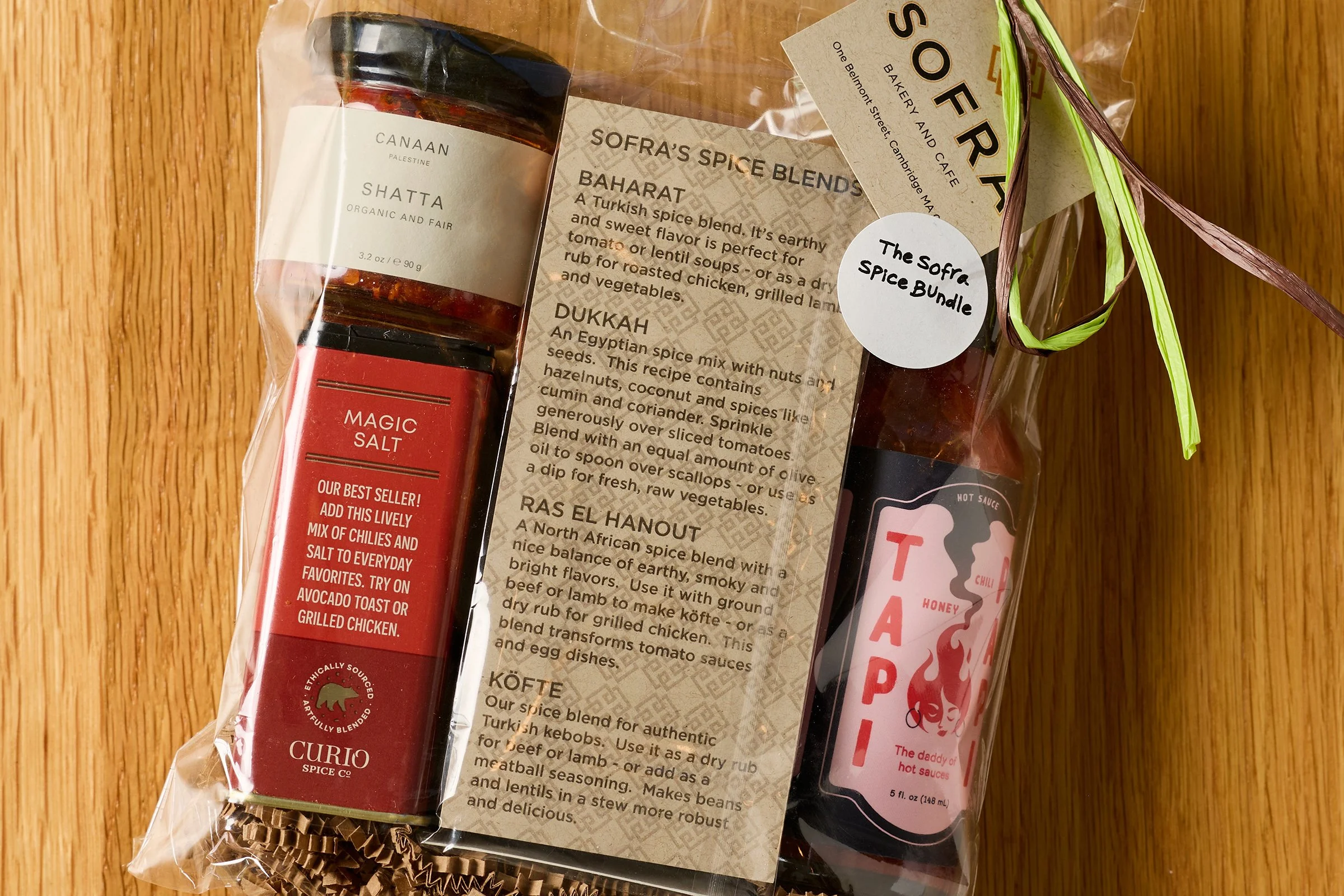 Our favorite spices and spicy condiments in one bundle. Includes: Tapi Papi Hot Sauce, Sofra Spice Tower (baharat, dukkah, kofte spice, ras el hanout)- Canaan Shatta (hot chili spread), Curio Magic Salt.