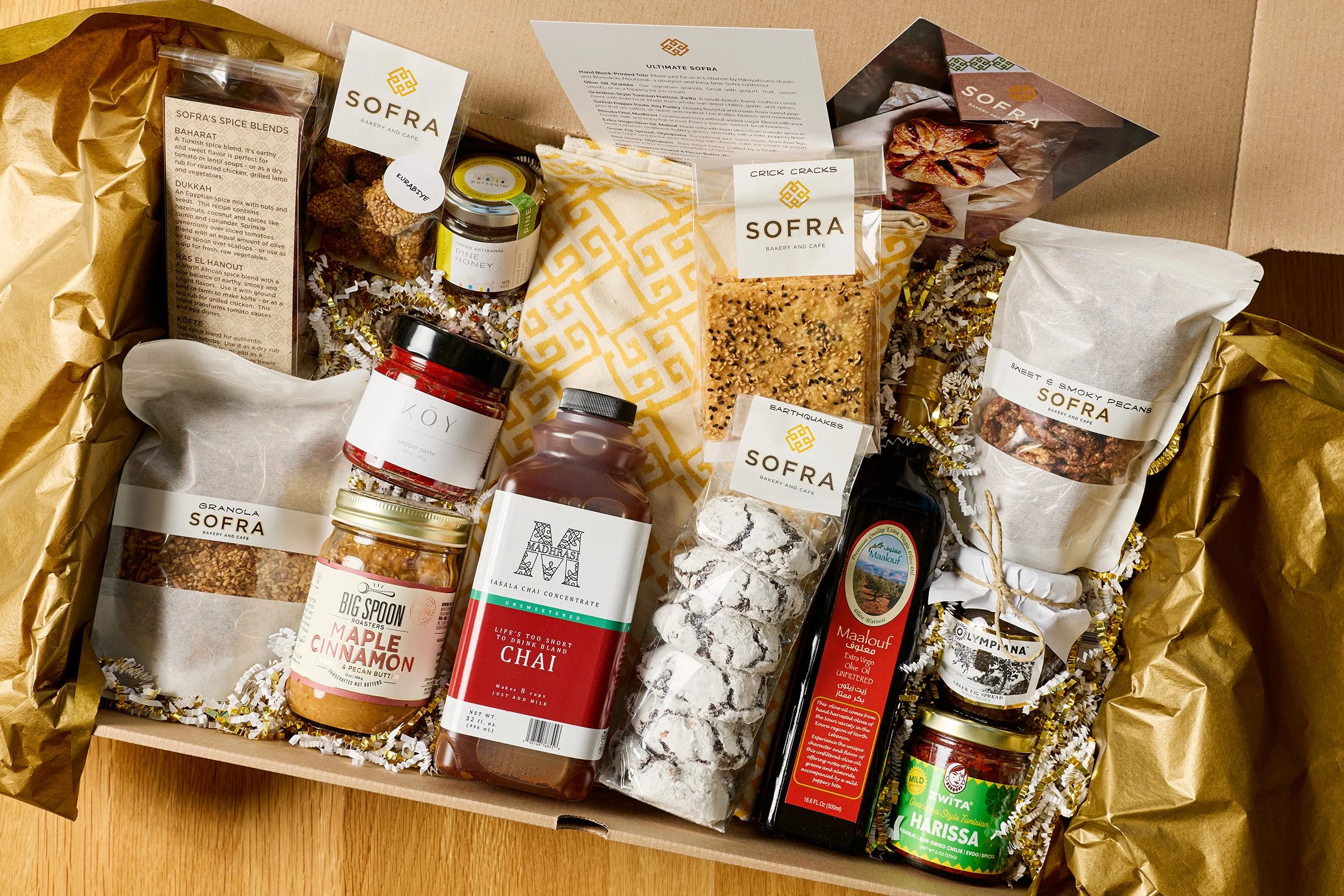 The Ultimate gift set of Sofra items. Includes: Sofra hand block-printed tote, Sofra olive oil granola, Zwita harissa, Koy Pantry pepper paste, Madhrasi Masala chai, Malouf extra virgin olive oil, Olympiana Fig Spread, Portoula Pine Honey, Big Spoon maple cinnamon nut butter, Sofra Spice Tower, Sofra earthquake cookies (6 pack), Sofra sweet & spicy pecans, Sofra crick cracks (6 pack), Nik's kurabiye, (dozen).